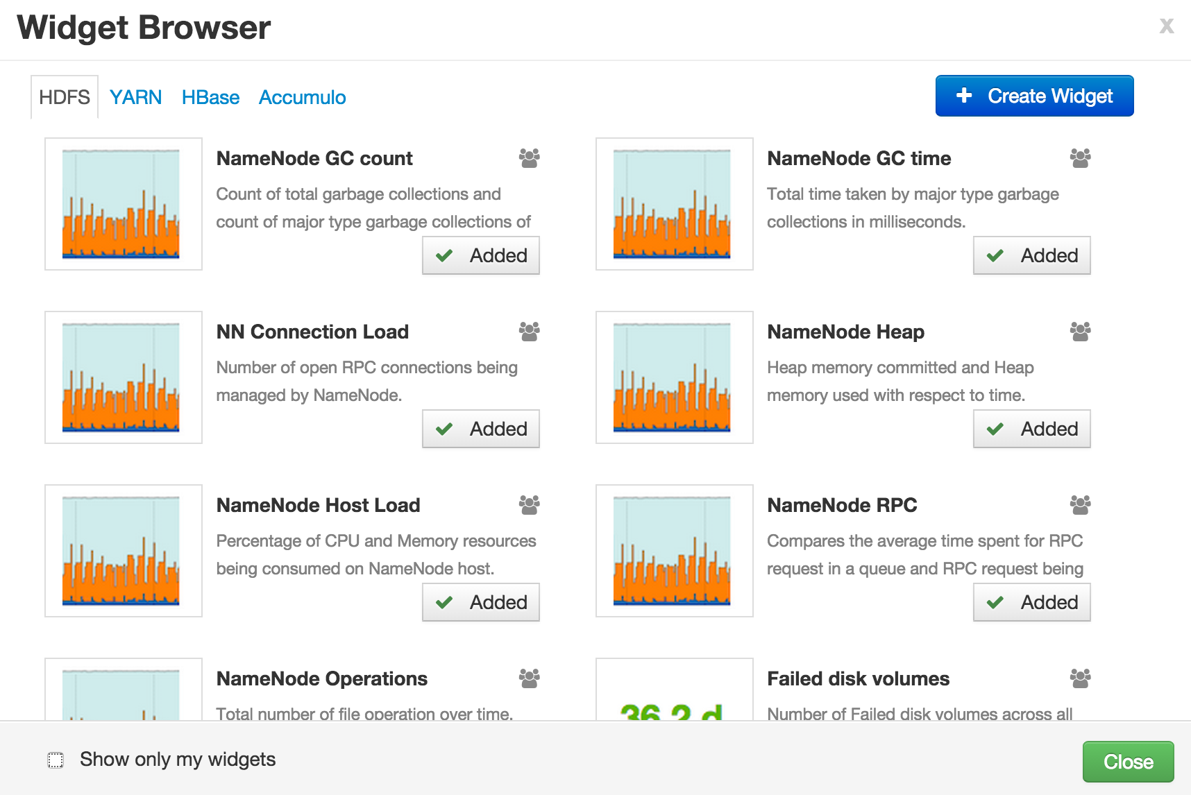The term Enhanced Service Dashboard is used for being able to seamlessly add new widgets to the service summary page and heatmap page. This feature enables stack service to be packaged with the widget definitions in the JSON format. These widget definitions will appear as default widgets on the service summary page and heatmap page on service installation. In addition new widgets for the service can be created any time on the deployed cluster.